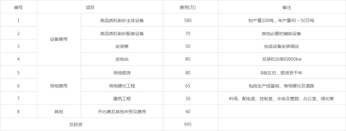 投資高品質(zhì)機制砂生產(chǎn)項目的費用主要包括設(shè)備費和場地,以50萬噸/年的生產(chǎn)線投資為例,投資成本明細如下。