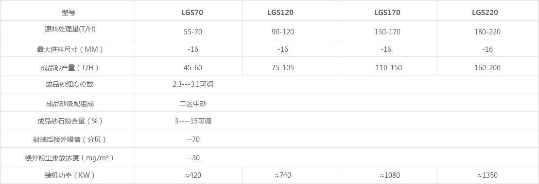 2、以上處理能力是以抗壓強度100MPA,進料粒度0-16mm的石灰石為原料,成品砂細度模數(shù)為2.3--3.1時的產(chǎn)量,不同原料和不同成品砂細度模數(shù)等要求不同,產(chǎn)量也不同。