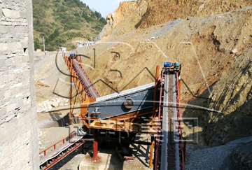 開山爆破的石灰石,經過F5X1360給料機預篩分,50mm以下小料及渣土進入除土篩,小料直接輸送到鄂破的出料皮帶上,大料經過顎破破碎后和小料一起進入中轉料倉,而后由皮帶輸送機進入一臺CI5X1520新型液壓反擊破破碎,出來的石料經過兩臺S5X2460-2新型振動篩篩分,大料返到一臺PF1315反擊破破碎,20-31.5mm成品碎石篩出,其余0-20mm碎石進入兩臺S5X2460-3進行篩分,篩分出0-5-10-20三種成品。