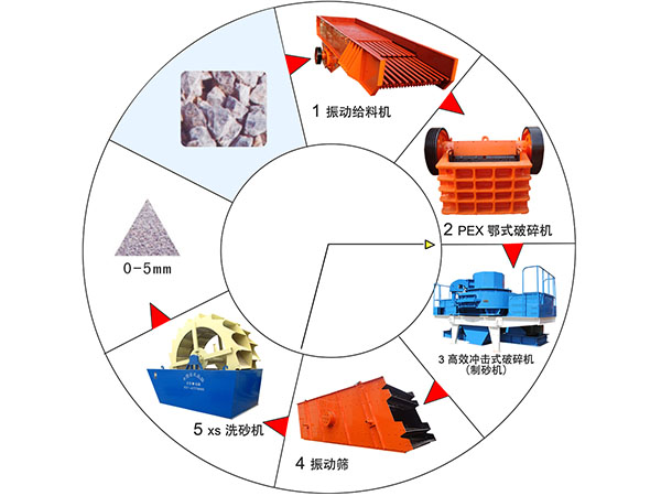 礦石由振動給料機均勻地送到顎式破碎機進行粗破,粗破后的物料由膠帶輸送機送入到制砂機進行進一步破碎,細碎后的物料被輸送到振動篩進行篩分,達到成品粒度要求的物料被送入洗砂機清洗,清洗后由成品輸送帶輸出即為成品;未達到成品粒度要求的物料從振動篩返回制砂機重新加工,形成閉路多次循環。成品粒度可按用戶的需求進行組合和分級。