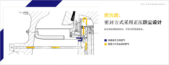 密封方式采用正壓防塵設計,運行過程中可提供高壓力和大風量潔凈的空氣,有效防止潤滑油污染,延長潤滑油使用時間,節省日常使用成本。