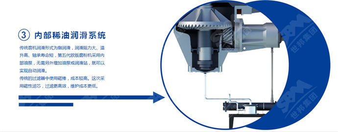傳統磨粉機潤滑形式為脂潤滑,潤滑阻力大、溫升高、軸承壽命短;上海世邦第五代歐版磨粉機采用內部油泵,無需另外增加油泵或潤滑站,就可以實現自動潤滑。