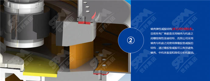 當前市場上蝸殼與機座之間多是采用螺栓剛性連接結構,而上海世邦使用厚橡膠墊減振的結構,通過橡膠墊減振可以有效避免蝸殼、中機體振裂和降低分析機振動。
