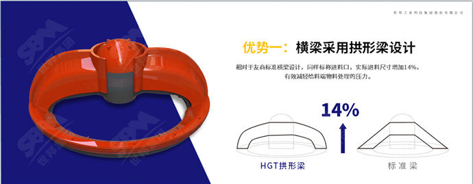相對于傳統破碎機的標準橫梁設計,上海世邦HGT旋回破碎機橫梁采用拱形梁設計,在同樣標稱進料口的情況下,實際進料尺寸增加14%,有效減輕給料端物料處理的壓力,提高破碎處理效率。