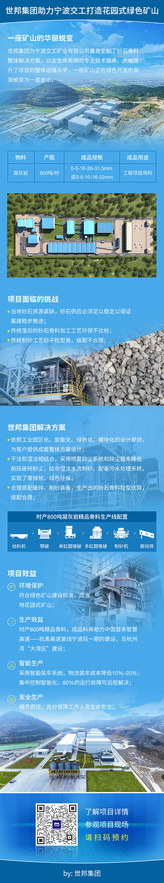 世邦集團為寧波交工礦業有限公司量身定制了砂石骨料整體解決方案,以全生命周期的專業技術服務,大幅提升了項目的整體運維水平,一座礦山正在綠色開發中漸漸蛻變為一座金山。