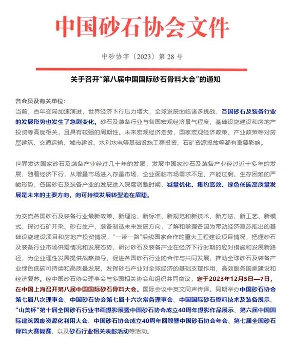 2023年12月5日-7日,由中國砂石協會主辦,世邦工業·黎明重工承辦的“第八屆中國國際砂石骨料大會”將于上海市浦東新區召開。