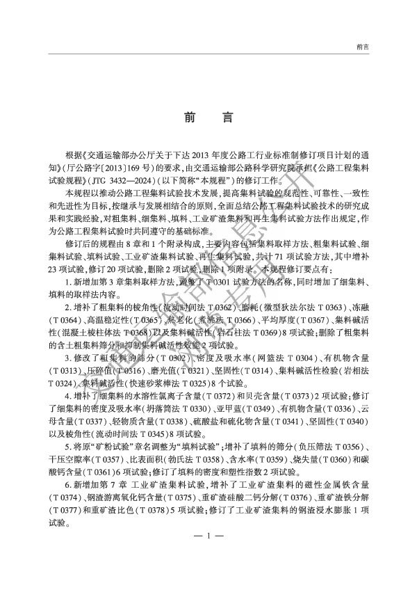 本規(guī)程以推動(dòng)公路工程集料試驗(yàn)技術(shù)發(fā)展,提高集料試驗(yàn)的規(guī)范性、可性、一致性和先進(jìn)性為目標(biāo),按繼承與發(fā)展相結(jié)合的原則,全面總結(jié)公路工程集料試驗(yàn)技術(shù)的研究成果和實(shí)踐經(jīng)驗(yàn),對(duì)粗集料、細(xì)集料、填料、工業(yè)礦渣集料和再生集料試驗(yàn)方法作出規(guī)定,作為公路工程集料試驗(yàn)時(shí)共同遵守的基礎(chǔ)標(biāo)準(zhǔn)。
