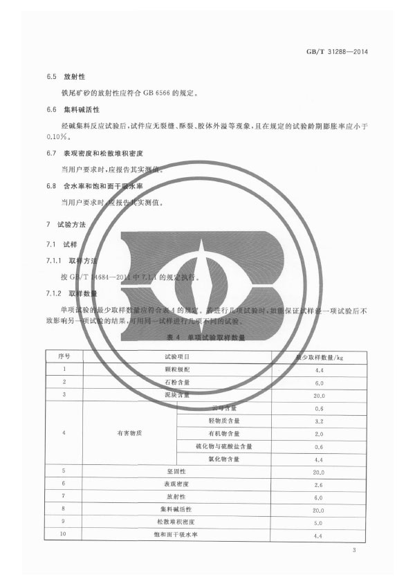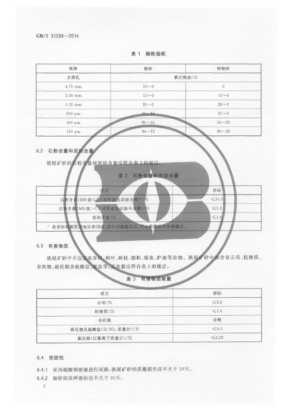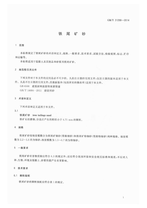 本標準規定了鐵尾礦砂的術語和定義、規格、一般要求、技術要求、試驗方法、檢驗規則、標志、貯存和運輸等。