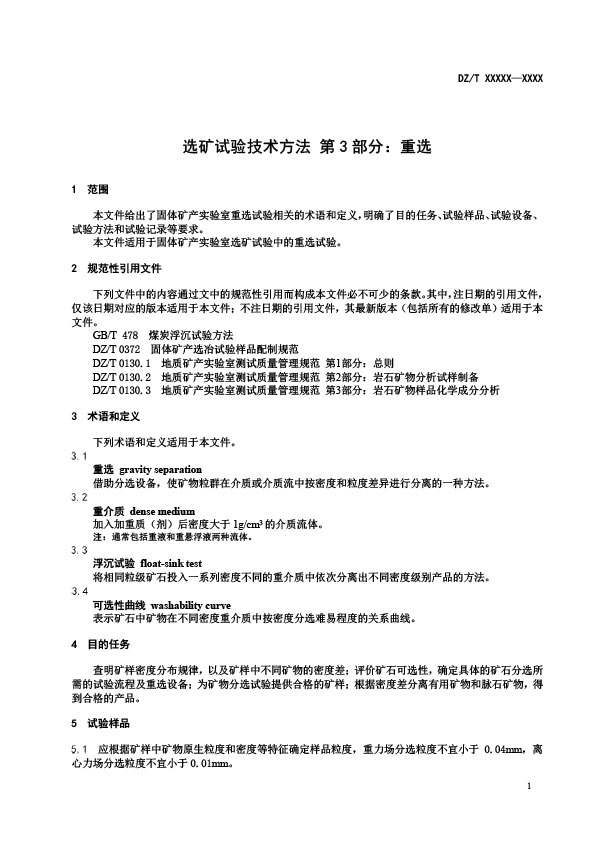 本文件給出了固體礦產(chǎn)實(shí)驗(yàn)室重選試驗(yàn)相關(guān)的術(shù)語(yǔ)和定義,明確了目的任務(wù)、試驗(yàn)樣品、試驗(yàn)設(shè)備,試驗(yàn)方法和試驗(yàn)記錄等要求。本文件適用于固體礦產(chǎn)實(shí)驗(yàn)室選礦試驗(yàn)中的重選試驗(yàn)。