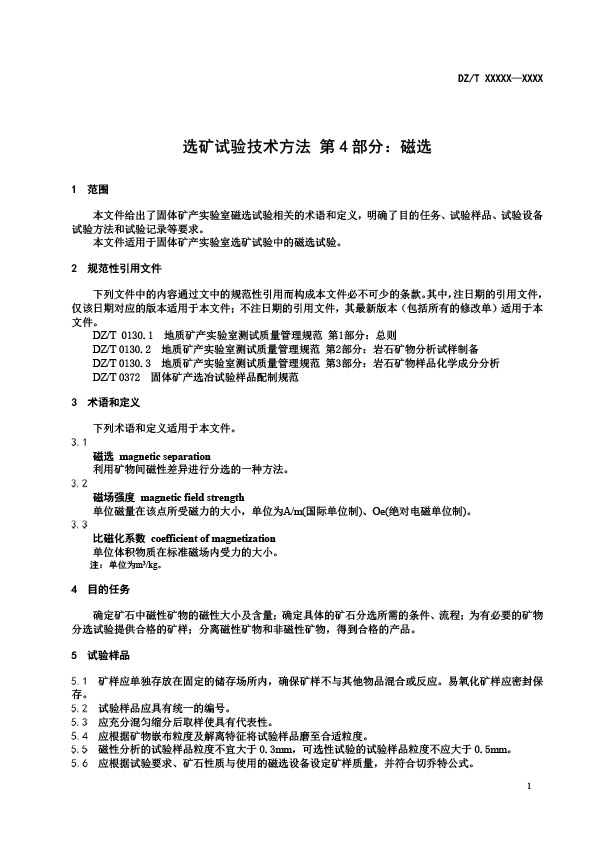 本文件給出了固體礦產實驗室磁選試驗相關的術語和定義,明確了目的任務、試驗樣品、試驗設備試驗方法和試驗記錄等要求。 本文件適用于固體礦產實驗室選礦試驗中的磁選試驗。