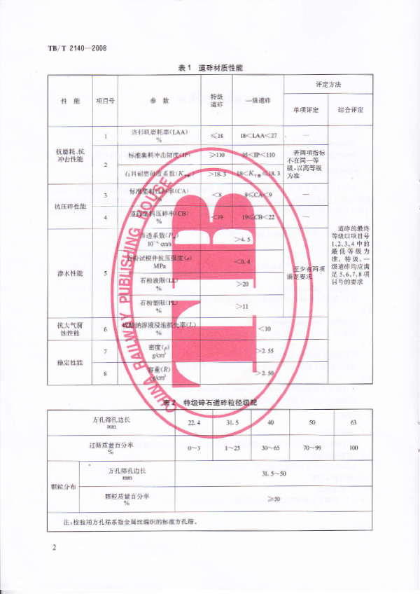本標準規定了鐵路碎石道砟的技術要求、檢驗規則和運輸、貯存、驗交。明確對道砟粒徑、級配、顆粒形狀及清潔度的檢驗指標;對道砟集料壓碎率指標值做出規范;對道砟運輸貯存提出了更為嚴格的要求,保證出場上道道砟的級配符合本標準的相關要求。